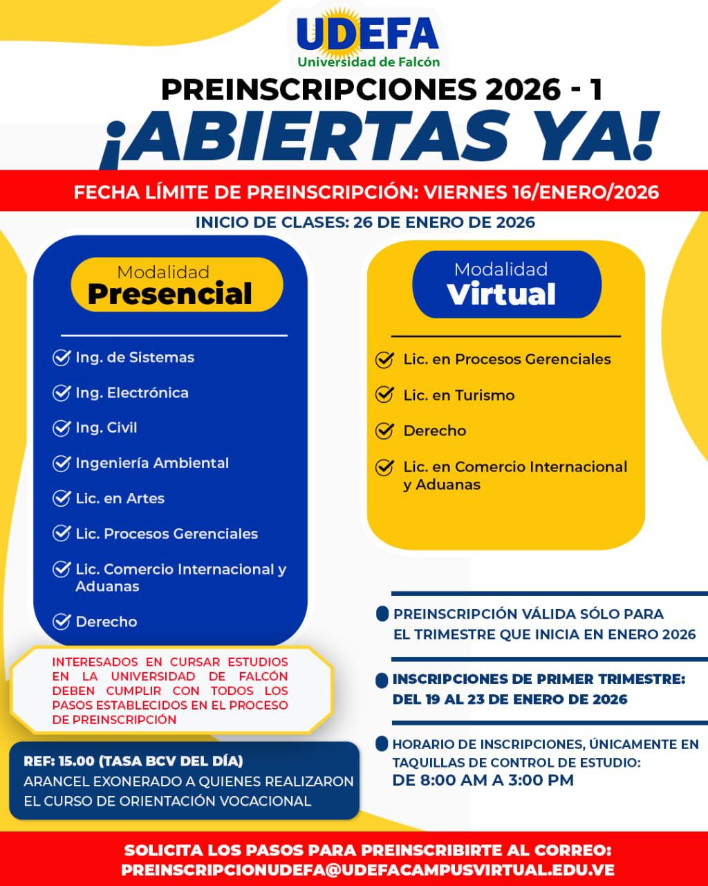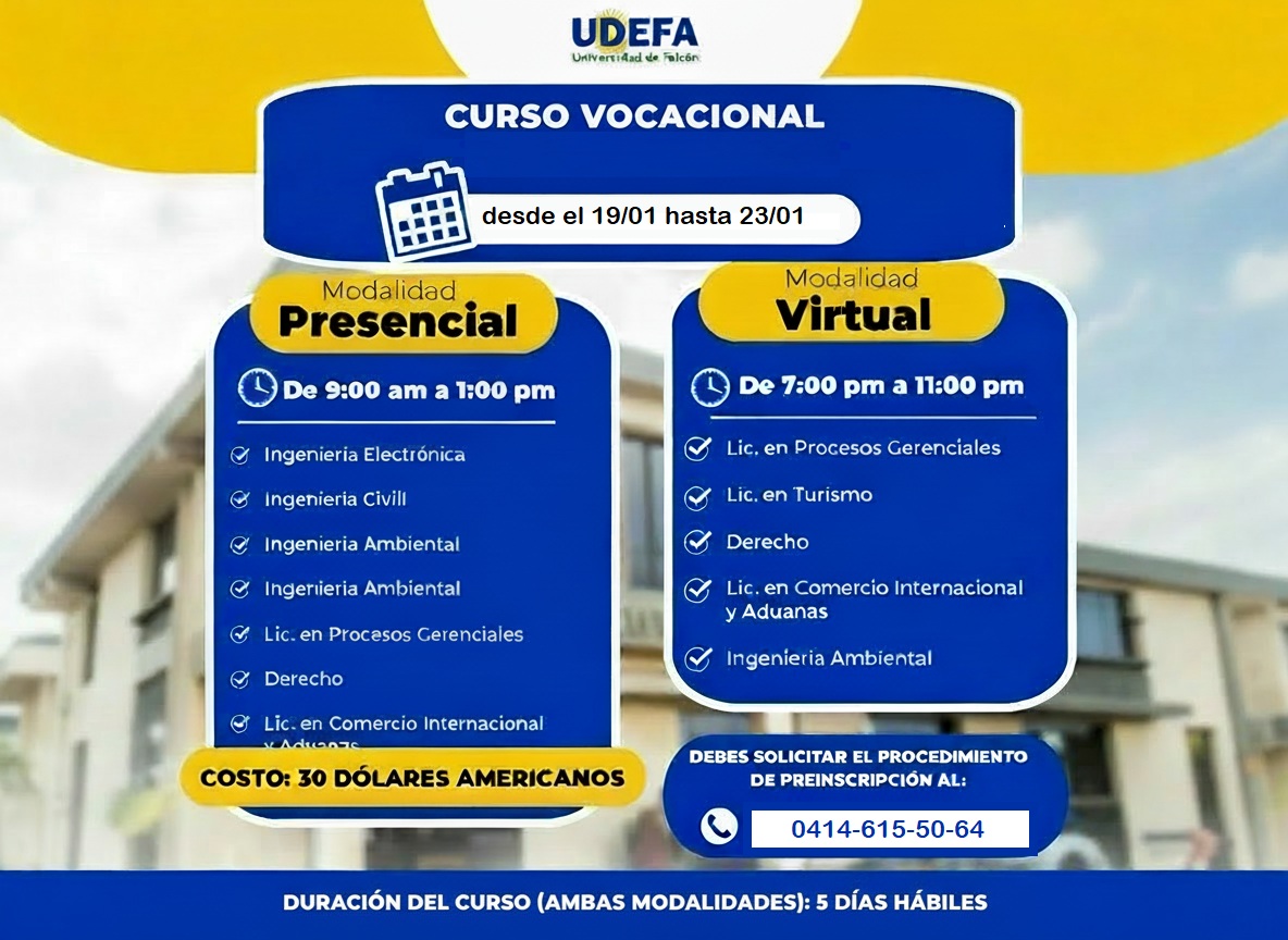 El Curso de Iniciación Universitaria es un requisito obligatorio para los bachilleres y profesionales que deseen iniciar estudios en la Universidad de Falcón. Sólo deben llenar la planilla de preinscripción y escoger uno de los cursos que se encuentren disponibles.